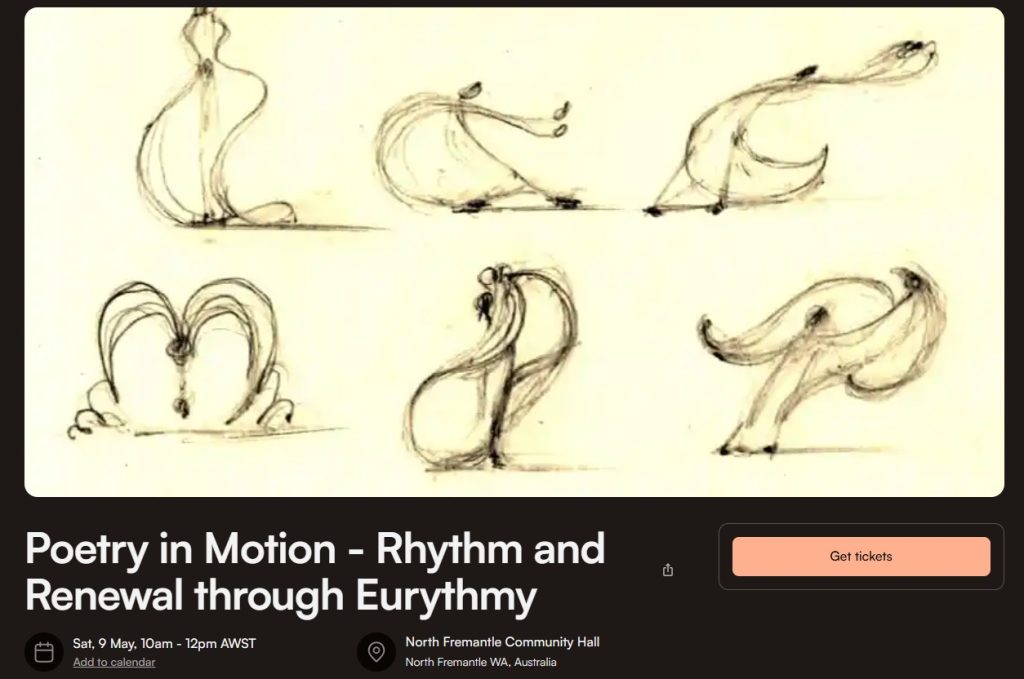 This foundations of Eurythmy workshop will guide you through specific movements, connecting us through space and the sounds of speech and music made visible. Deep listening, harmonious rhythms, spatial presencing and patterning, fun and challenge together with the group await. This is a structured, guided session for those interested in experiencing Eurythmy – the art of movement created by Rudolf Steiner and a core subject in Steiner schools. This session will also introduce the work of Eurythmy for social and workplace organisational development, fresh from the intensive training held over East.